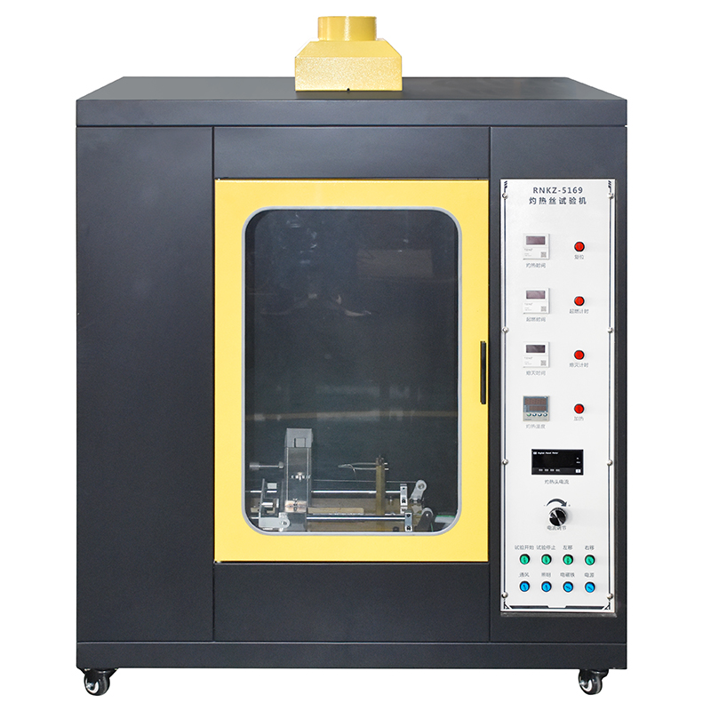 RNKZ-5169灼热丝试验机用于检测部件或零件在故障或过载条件下,可能达到过高的温度或点燃它们附近的零件,灼热丝试验模拟灼热元件或过载的电阻之类的热源或点火源在短时间所造成的热应力,用模拟技术评定着火危险性,适用于对电工电子产品、元件、家用电器部件用的塑料及非金属绝缘材料零件等主要运用于照明设备、低压电器、电工仪表、等电工电子产品及其组件部件的研究、生产和质检部门。