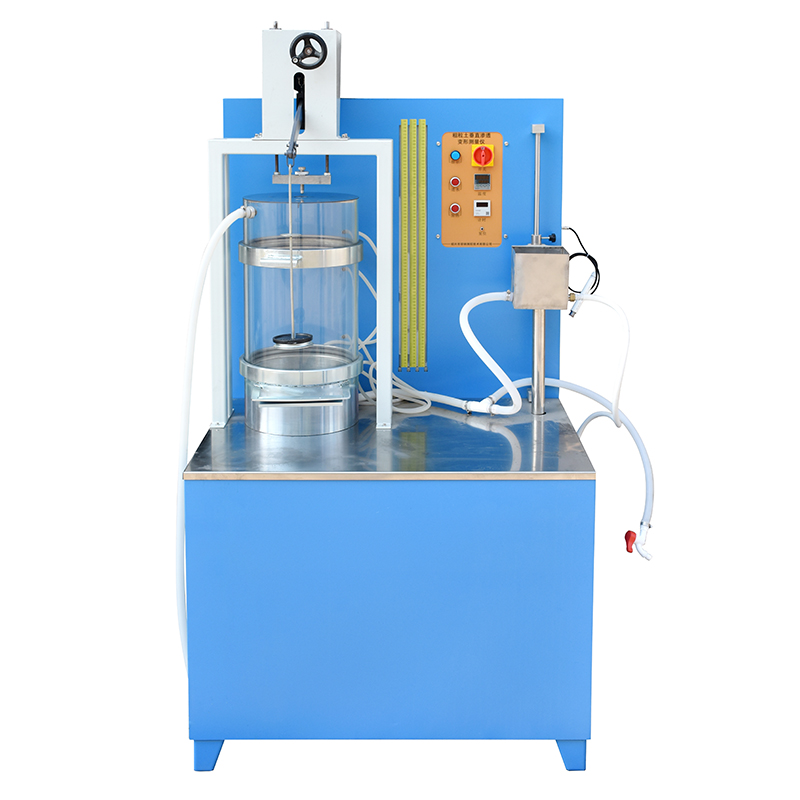 设备试样容器为金属圆筒型式。圆筒上、下两面装有金属多孔透水板,试样底部进水,其侧面有水头压力测量开关和排气三通与水位测量排连接。试样中部侧面不同高度有两个水位测量开关与相应的水位测量排管连接,试样的顶部设有溢水口用于测量渗透流量,溢水压力由顶部的测量排管测量。